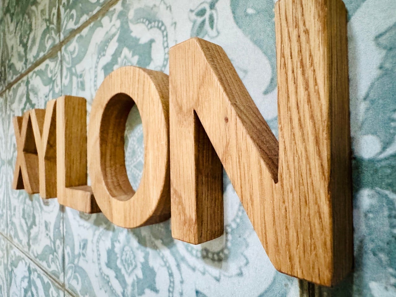 Die Eiche verleiht den Buchstaben nicht nur ein zeitloses und elegantes Erscheinungsbild, sondern sorgt auch für eine hohe Langlebigkeit. Die natürliche Holzoberfläche kann je nach Wunsch geölt, lackiert oder naturbelassen verwendet werden.